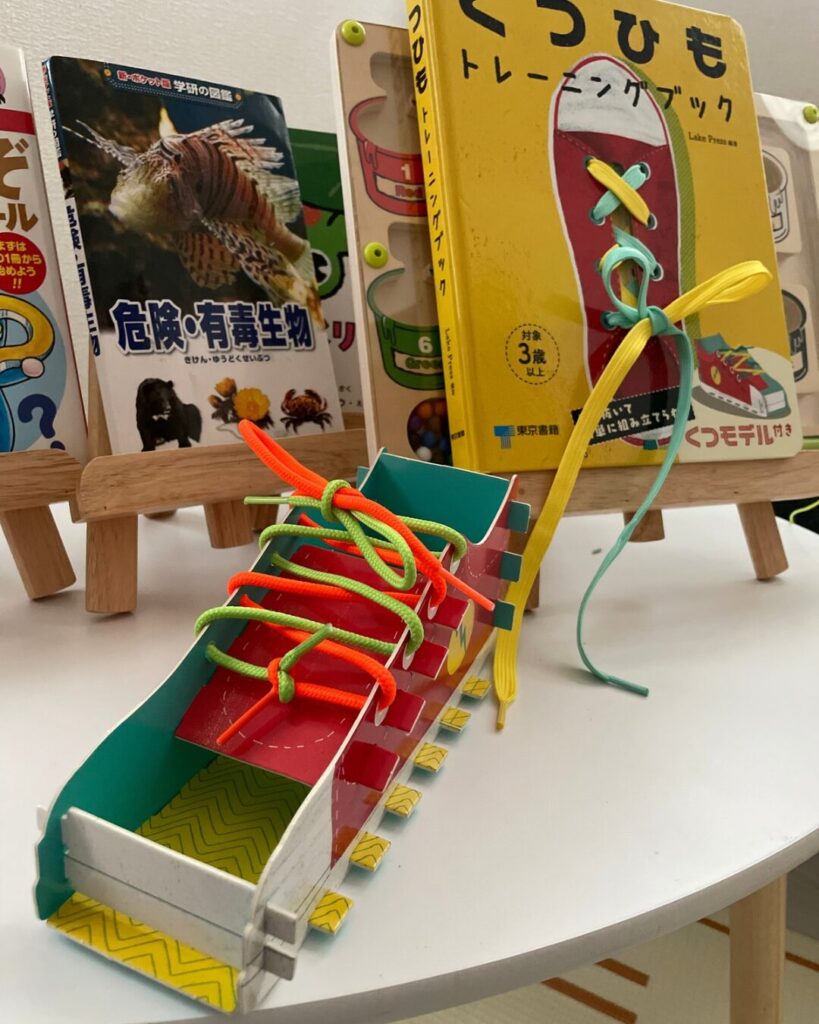 靴ひも結びの練習もこれなら楽しんでできたみたいで何回も挑戦👌そして時間をおいてまた挑戦!また少し自信がついたね😉